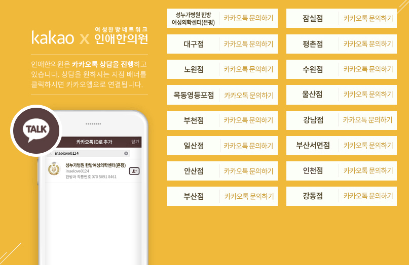 각 지점 카톡문의 버튼을 클릭하시면 카카오앱으로 바로 연결됩니다.